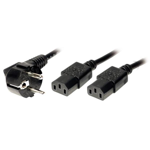 védő érintkezős, háromvezetékes, európai biztonsági normáknak megfelelő hálózati Y tápkábel, két "műszercsatlakozós" végződéssel, számítógépekhez, nyomtatókhoz és egyéb perifériákhoz